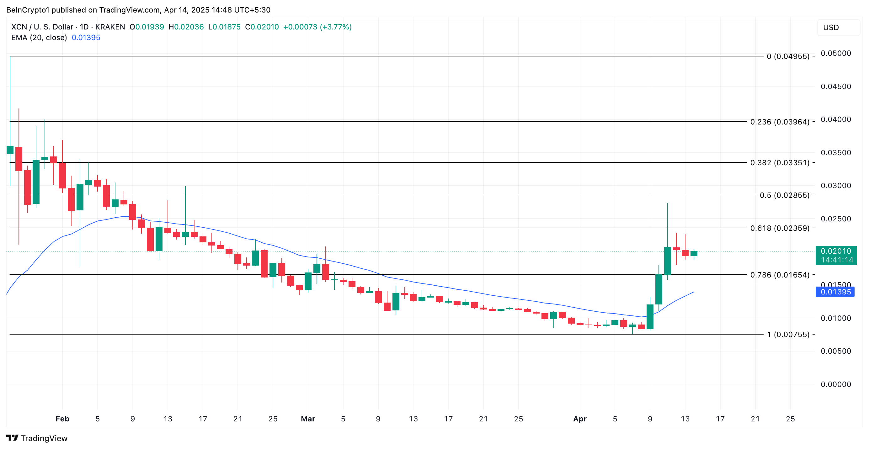 जनवरी में $0.049 के लोकल साइकिल हाई पर पहुंचने के बाद, XCN एक डाउनट्रेंड में चला गया, और अगले कुछ महीनों में इसका मूल्य काफी गिर गया। यह गिरावट 7 अप्रैल को $0.007 के निचले स्तर पर पहुंचकर समाप्त हुई। हालांकि, यह एक टर्निंग पॉइंट साबित हुआ।