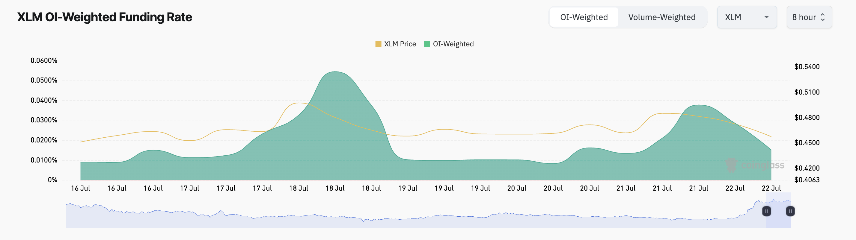 ऑन-चेन डेटा इस pennant के ऊपर XLM के अपवर्ड ब्रेकआउट की संभावना की पुष्टि करता है। उदाहरण के लिए, टोकन की फंडिंग रेट पॉजिटिव बनी हुई है, जो लंबी पोजीशन की मांग को दर्शाती है। Coinglass के अनुसार, यह प्रेस समय में 0.0152% पर है।