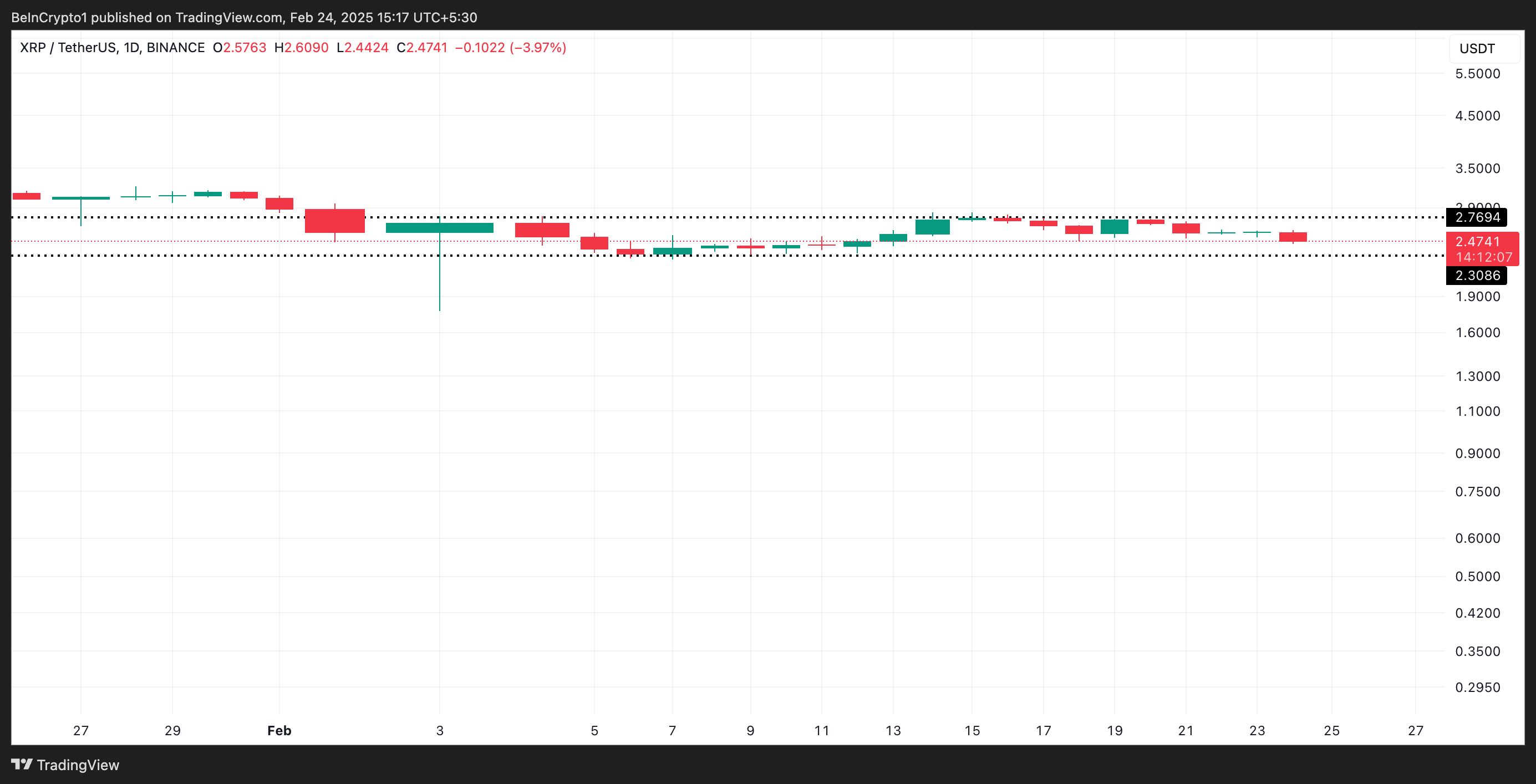 फरवरी की शुरुआत से, खरीद और बिक्री के दबाव के बीच सापेक्ष संतुलन ने XRP को एक संकीर्ण प्राइस रेंज में रखा है। इसे $2.76 पर महत्वपूर्ण प्रतिरोध का सामना करना पड़ा है और $2.30 पर बुलिश समर्थन मिला है।