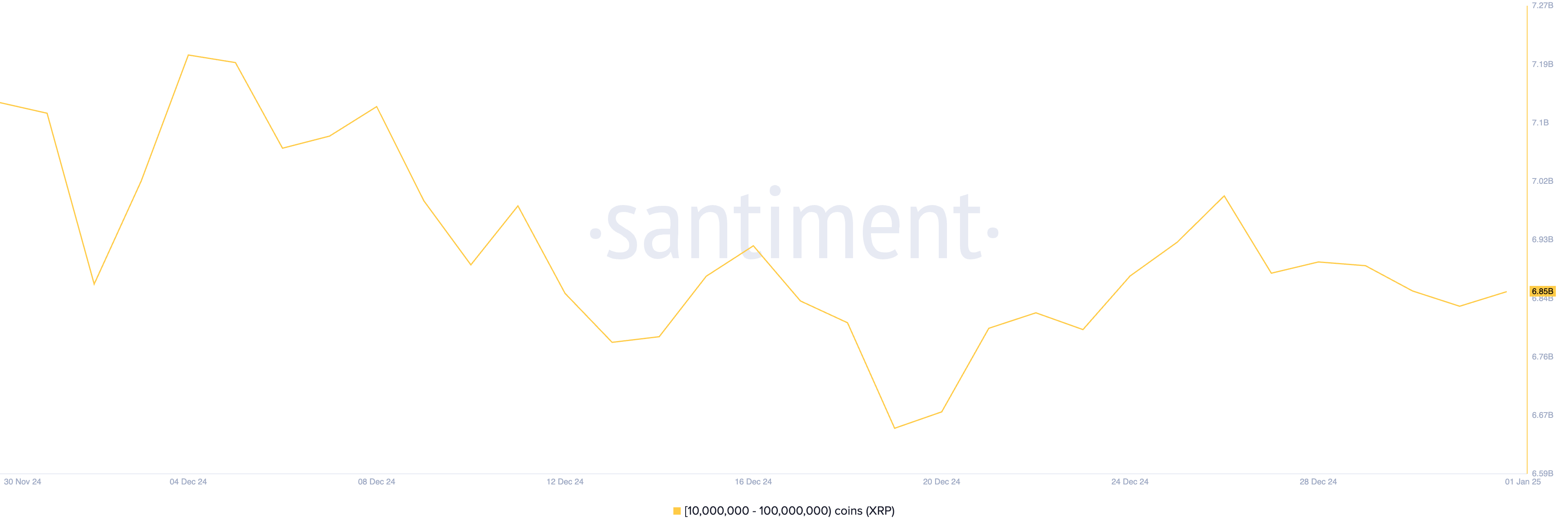Santiment के अनुसार, XRP व्हेल्स जो 10,000,000 से 100,000,000 टोकन्स को नियंत्रित करते हैं, उन्होंने 4 दिसंबर से अपनी होल्डिंग्स को 350 मिलियन XRP तक कम कर दिया है। इसका मतलब है कि समीक्षा की गई अवधि के दौरान, इस XRP निवेशकों के समूह ने सामूहिक रूप से $746 मिलियन के टोकन्स बेचे हैं, जो इसकी कीमत पर डाउनवर्ड प्रेशर में योगदान दे रहे हैं।