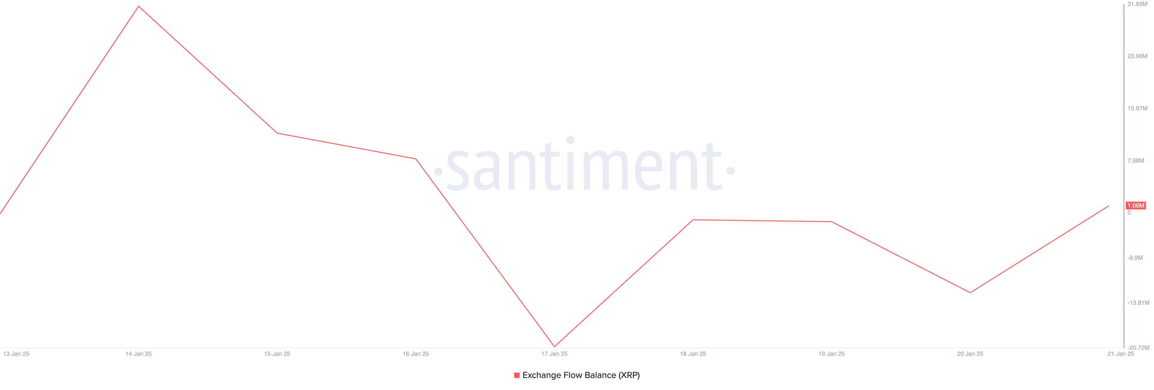 इसके अलावा, XRP के बढ़ते एक्सचेंज फ्लो बैलेंस ने पिछले सप्ताह में टोकन सेलऑफ़ में वृद्धि की पुष्टि की है। Santiment के अनुसार, यह 17 जनवरी से 105% बढ़ गया है, एक दिन बाद जब XRP एक नए ऑल-टाइम हाई पर पहुंचा।