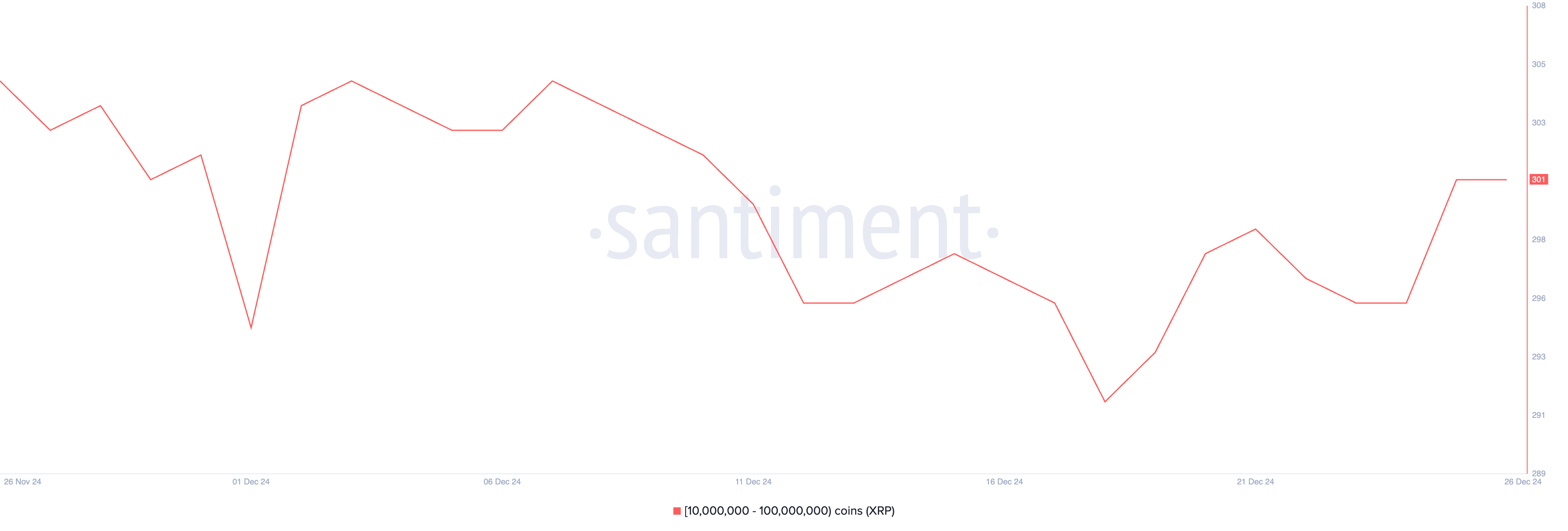 10 मिलियन से 100 मिलियन टोकन रखने वाले XRP व्हेल की संख्या 301 पर स्थिर हो गई है, जो 24 दिसंबर को 296 से बढ़ी है। यह 18 दिसंबर को 292 के महीने के निचले स्तर से रिकवरी के बाद है, जो बड़े धारकों द्वारा नए सिरे से संचय का संकेत देता है।