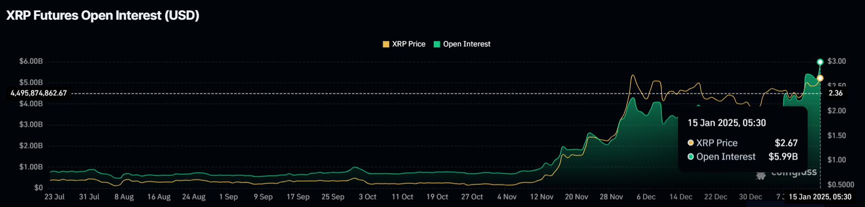XRP का ओपन इंटरेस्ट (OI) $5.99 बिलियन के ऑल-टाइम हाई पर पहुंच गया है, जो ट्रेडर्स की बढ़ती भागीदारी को दर्शाता है। OI में वृद्धि बाजार के आशावाद का एक मजबूत इंडिकेटर है, जिसमें ट्रेडर्स XRP में फंड डाल रहे हैं, आगे के लाभ की उम्मीद कर रहे हैं।