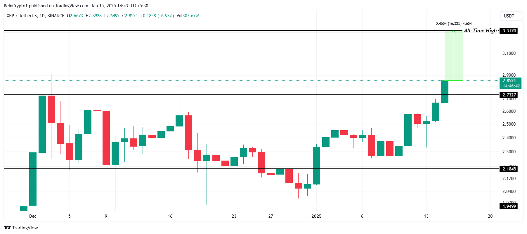 XRP सिर्फ अपने ATH $3.31 से 16% दूर है, और अब $2.85 पर ट्रेड कर रहा है। $2.73 के प्रतिरोध के हालिया ब्रेक ने एक महत्वपूर्ण उपलब्धि को चिह्नित किया है, जो आगे के लाभ के लिए मंच तैयार कर रहा है।