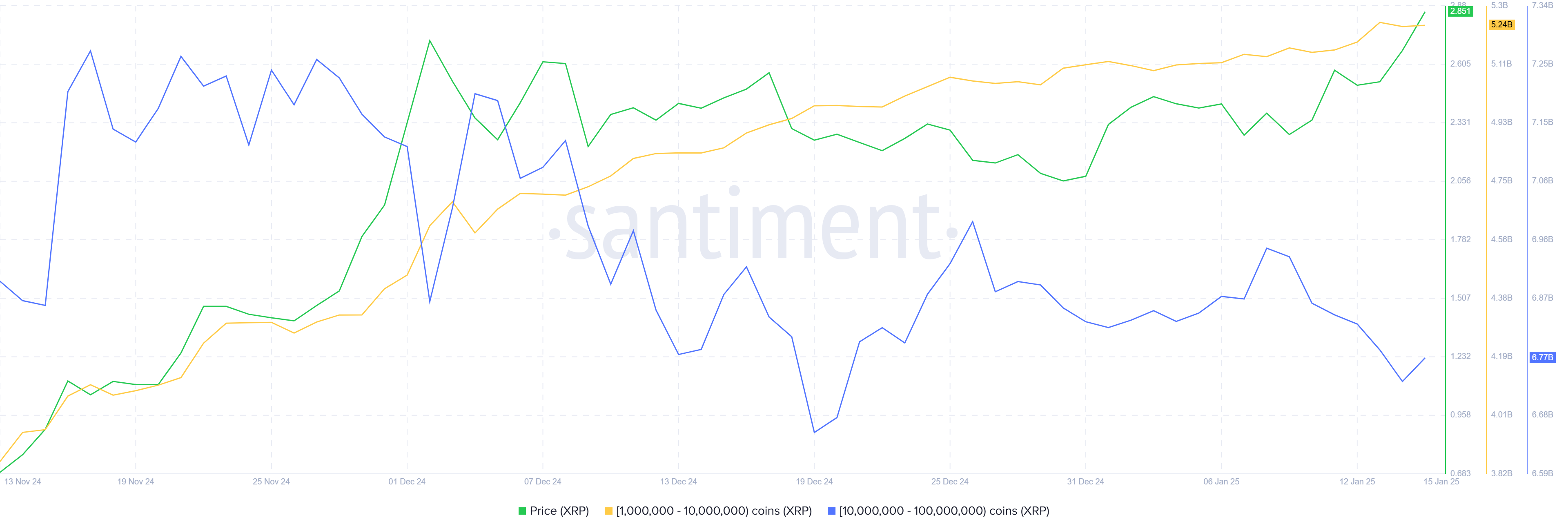 व्हेल का व्यवहार XRP की प्राइस डायनामिक्स में एक महत्वपूर्ण भूमिका निभा रहा है। 10 मिलियन से 100 मिलियन XRP रखने वाले वॉलेट्स का प्राइस ट्रेंड्स के साथ ऐतिहासिक रूप से विपरीत संबंध होता है। इन व्हेल्स ने हाल ही में एक सप्ताह के भीतर 21 मिलियन XRP, $60 मिलियन के मूल्य के, बेचे, जिससे वर्तमान प्राइस वृद्धि को बढ़ावा मिला।