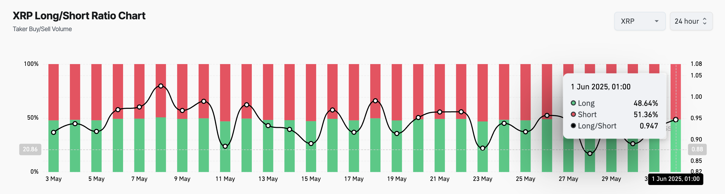 पिछले कुछ हफ्तों में XRP के टेकर बाय/सेल रेशियो में लगातार गिरावट फ्यूचर्स ट्रेडर्स के बीच बढ़ते सेल-ऑफ़ की ओर इशारा करती है, जिनमें से कई अपनी शॉर्ट पोजीशन्स को बढ़ा रहे हैं।
