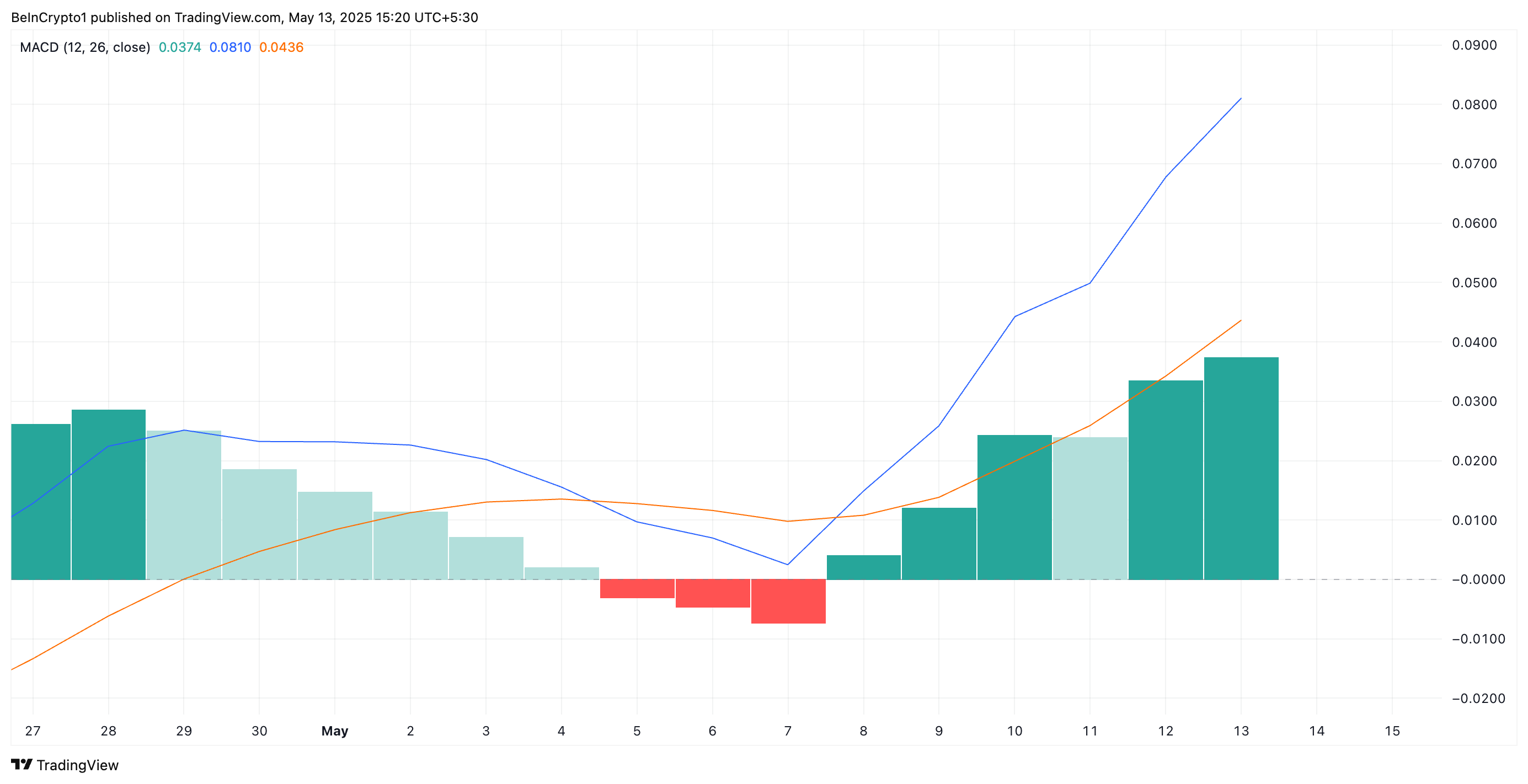 इसके अलावा, तकनीकी इंडिकेटर्स इस बुलिश दृष्टिकोण को मजबूत करते हैं। दैनिक चार्ट पर, XRP के मूविंग एवरेज कन्वर्जेंस डाइवर्जेंस (MACD) से रीडिंग्स दिखाती हैं कि इसकी MACD लाइन (नीला) सिग्नल लाइन (नारंगी) के काफी ऊपर है।
