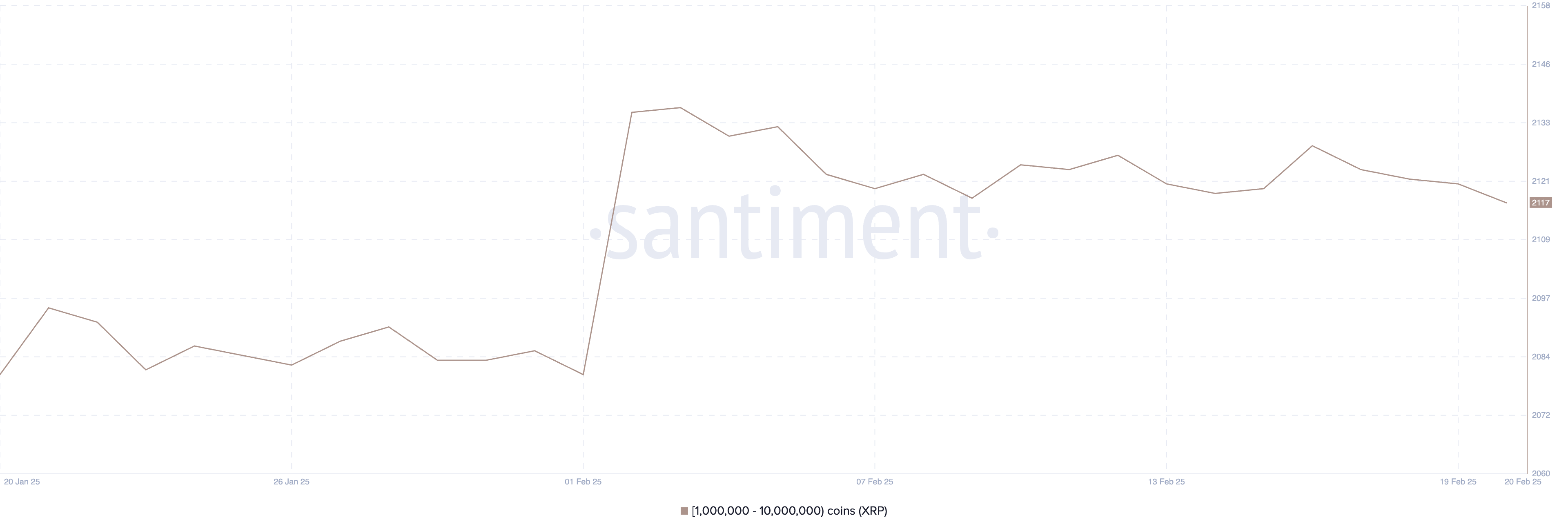 XRP व्हेल एड्रेसेस, जो 1 मिलियन से 10 मिलियन XRP के बीच होल्ड करते हैं, 3 फरवरी को 2,137 पर पीक पर थे लेकिन तब से घट रहे हैं, अब 2,117 पर हैं।
