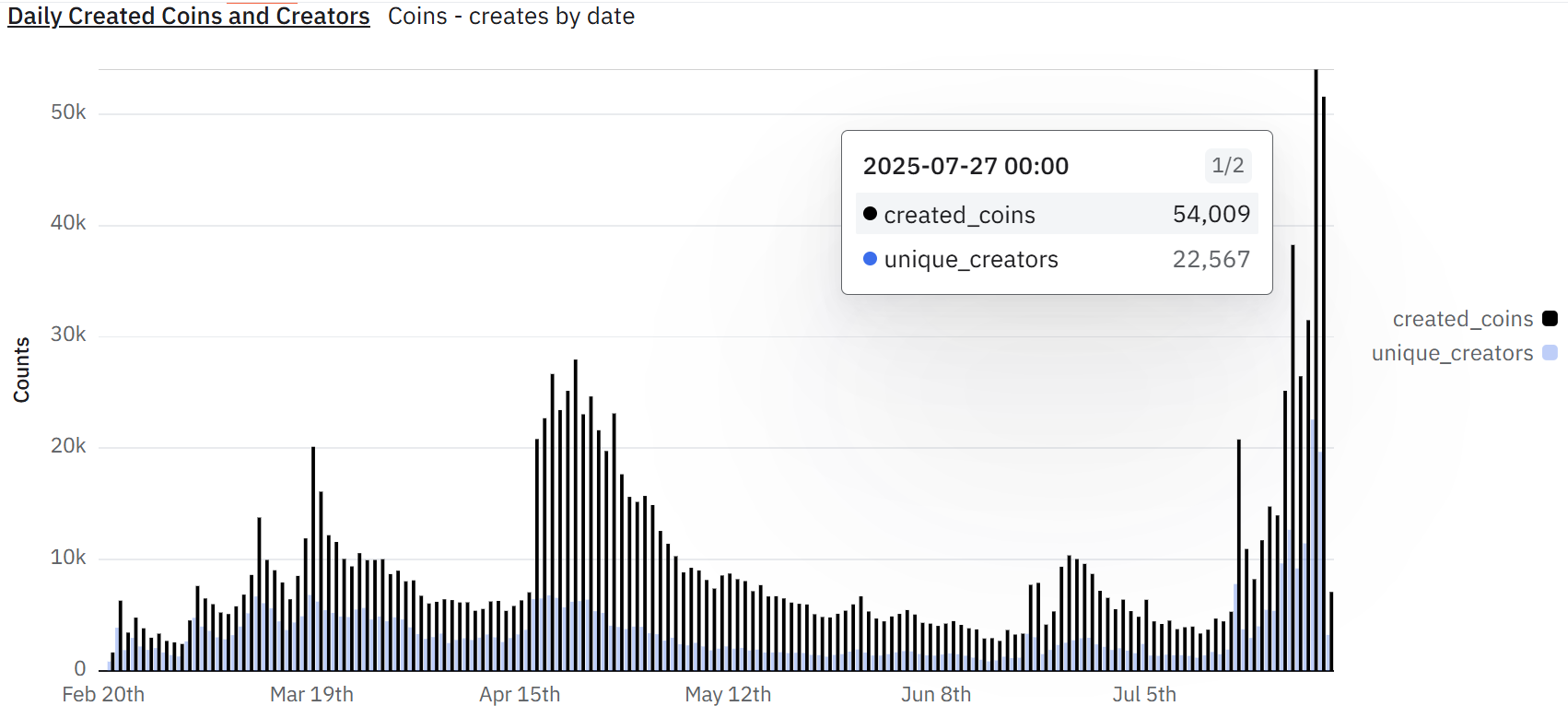 पिछले 48 घंटों में ही, Zora ने 100,000 से अधिक टोकन का निर्माण देखा है, जो मांग में मजबूत वृद्धि का संकेत देता है। 27 जुलाई को, 54,009 कॉइन्स मिंट किए गए, और अगले दिन 51,000 कॉइन्स और बनाए गए। इस टोकन निर्माण में वृद्धि Zora में बढ़ती एडॉप्शन और रुचि को दर्शाती है, जिससे यह प्लेटफॉर्म Pump.fun जैसे प्रतिस्पर्धियों से आगे बढ़ रहा है।
